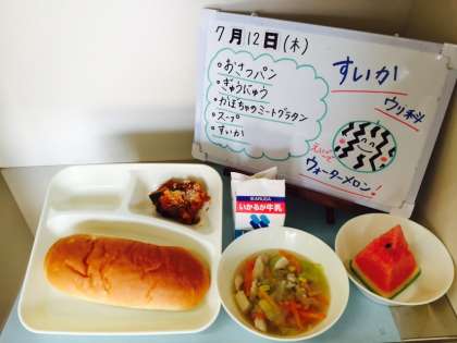今日の給食は、おさつパン、牛乳、かぼちゃのミートグラタン、スープ、すいかです。