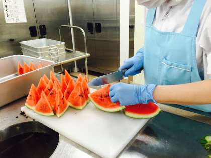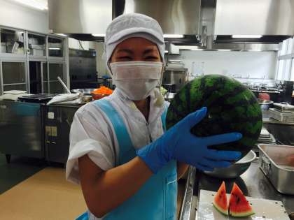 調理員さんの顔より大きいすいかを上手に切ってくださいました。