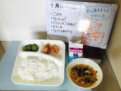 今日の給食は、ごはん、牛乳、豚肉の香味あげ、みそ汁、きゅうりの甘酢づけです。