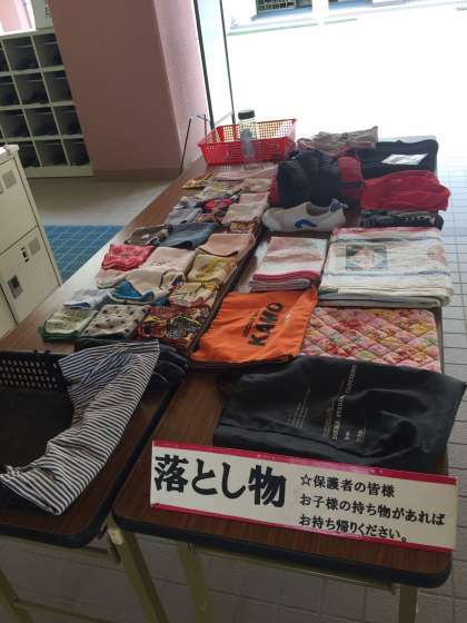 先日も連絡をしましたが、お子さまの落とし物(大切な持ち物)を、玄関前に並べています。ご確認をお願いします。