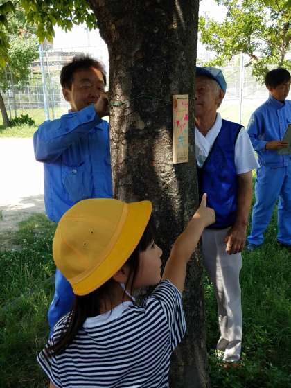 三軒家公園の木々に、子どもが作った樹木札を取り付けてもらっています。自分の作った札が一本一本取り付けられ、みんな嬉しそうでした。子ども15人、地域・保護者の方10人の方が参加しました。