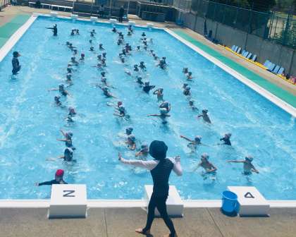 アヒルの声に合わせて、元気いっぱい水の中で運動しています。