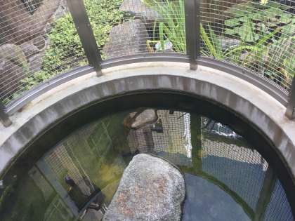 中庭の池の様子です。ハスが咲いていて、カメが元気にすごしています。