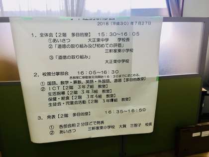 本校が主催で、大正東中学校にて小中連携(小小連携含む)研修会を行いました。全体会のテーマは、「道徳についての取り組み」でした。