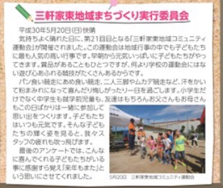 区民だより「こんにちは 大正 8月号」で、5月20日(日)に行われた三軒家東地域まちづくり実行委員会の活動『三軒家東地域コミュニティ運動会』が紹介されています。