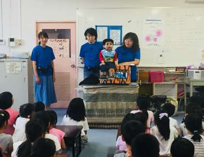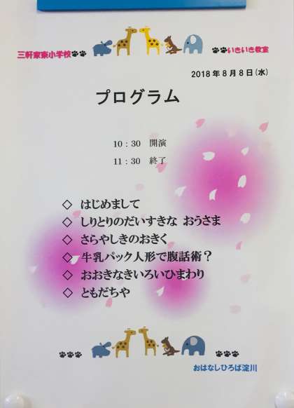 今日は、はっはっはっはーの「お笑いの日」のようです。いきいき教室で「おはなし広場 淀川」さんによる出前授業が行われています。