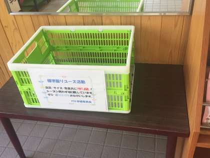PTA活動 学級委員さんが、標準服リユース活動をしてくださっています。リユース用標準服の回収ボックスを玄関に置いています。お子さまの成長に伴って、サイズが小さくなった標準服の「回収」に、ご協力ください。