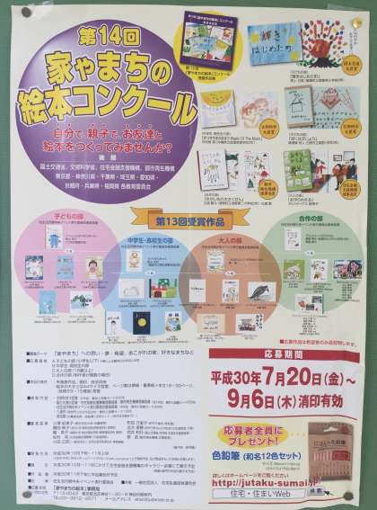 図書館前の掲示板に貼っている「家やまちの絵本コンクール」の案内です。
