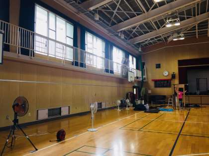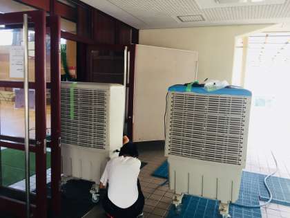 PTAの方が、劇鑑賞の準備をしてくださっています。熱中症予防対策として、大型冷風機2台を設置してくださいます。