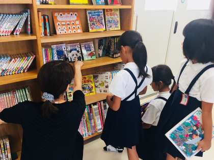 児童は、読みたい本の場所を学校図書館補助員さんに教えていただいています。