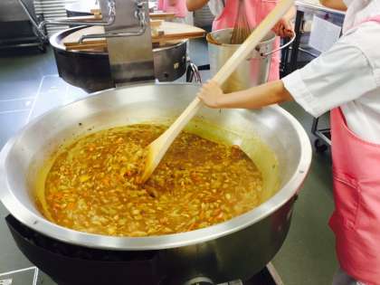 今日のカレーは、小麦アレルギーのある児童も食べられるように米粉のカレールウの素を使用しています。「おいしかった〜」「3回おかわりしたよ!」と子どもたちに好評でした。