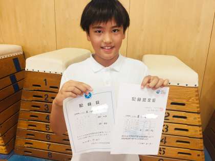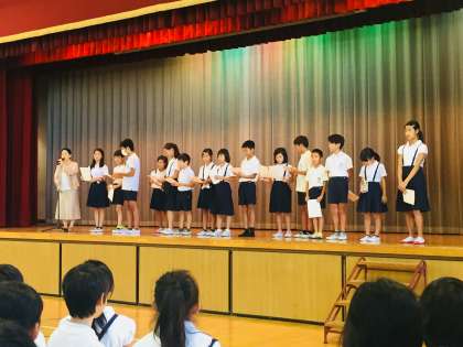 児童朝会で表彰式が行われました。夏休み中に行われた大阪市水泳協会主催の「児童泳力記録会」と大阪市小学校体育連盟主催の「大阪市児童水泳記録会」に参加した児童が、校長先生から表彰されました。
