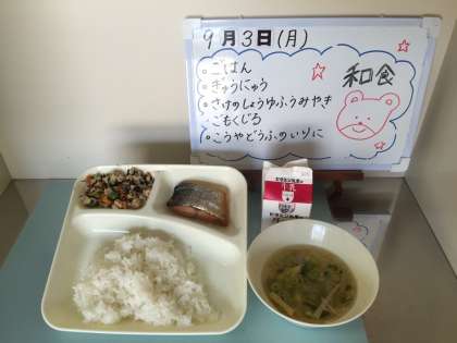 今日の給食は、ごはん、牛乳、さけのしょうゆ風味焼き、五目汁、高野どうふのいり煮です。