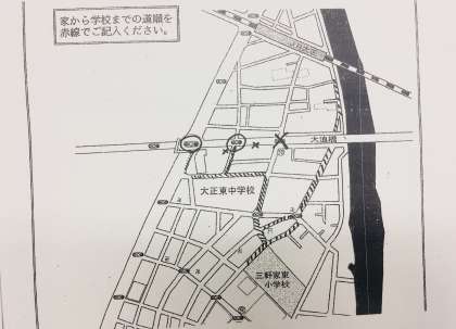尚、登校につきましても、なるべく、大浪橋西詰の信号機のところを渡らないようにして、郵便局前の信号機、駐車場(タイムス大正駅前)の信号機のところの横断歩道を渡るようにご家庭でもお声掛けをお願いします。おうちの場所によっては、木津川沿いの高架下を通る道を通って登校するのも良いかと思います。