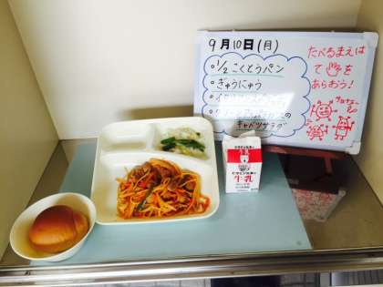 今日の給食は、1/2黒糖パン、牛乳、イタリアンスパゲッティ、グリーンアスパラガスとキャベツのサラダです。