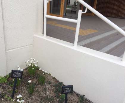 玄関に咲いている花です。玄関にある花や木にはネームプレートをつけています。ネームプレートには、名前と特ちょうが書かれています。名前は、なんでしょうか。
