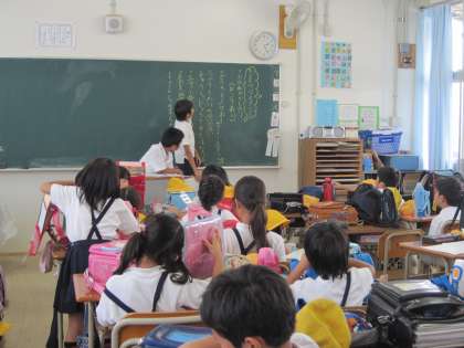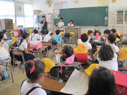 今日は地区分団で各教室に集まって、夏休みのくらしについて話し合ったり、通学路での危険個所の確認をしました。その後、保護者やPTAの方々と、子ども110番の家の確認と、危険箇所の点検をしながら集団下校をしました。