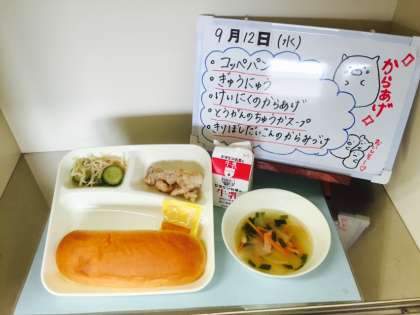今日の給食は、コッペパン、牛乳、鶏肉のからあげ、とうがんの中華スープ、切り干し大根のからみづけです。