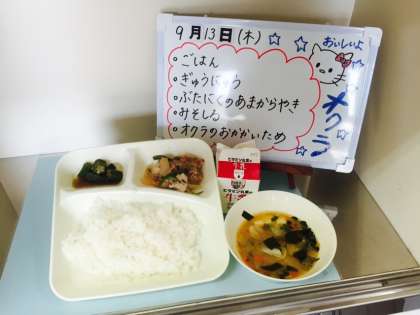 今日の給食は、ごはん、牛乳、豚肉の甘辛焼き、みそ汁、オクラのおかかいためです。