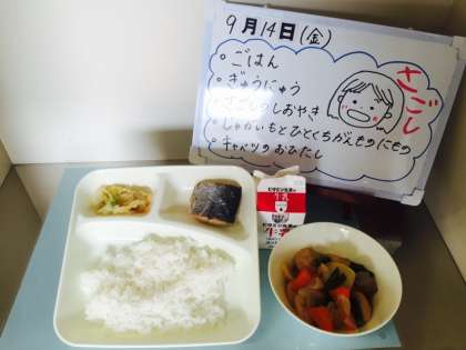 今日の給食は、ごはん、牛乳、さごしの塩焼き、じゃがいもと一口がんもの煮物、キャベツのお浸です。