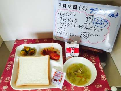 今日の給食は、食パン、牛乳、フランクフルトのケチャップソース、スープ、焼きかぼちゃです。