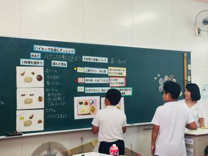 栄養教育の指導教諭に来ていただき、研究授業をしています。児童は、バランスの良い「バイキング給食にチャレンジ」をしています。