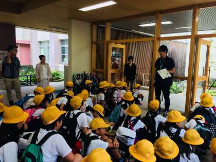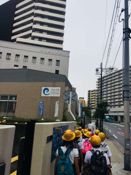 4年生は、予定通り学校をして出発し、今「津波・高潮ステーション」に着きました。