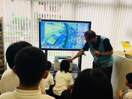 見学をしている様子です。南海トラフ巨大地震 津波による浸水想定区域を見ています。三軒家東小学校は、黄緑色の区域で、浸水の深さは1.0m〜2.0mでした。