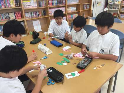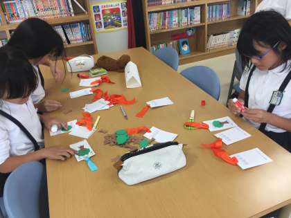 図書委員会の活動の様子です。11月20日から28日に読書週間をします。図書委員会では、読書週間期間中に図書館開放を利用した児童にわたすプレゼント(しおり)を作っています。