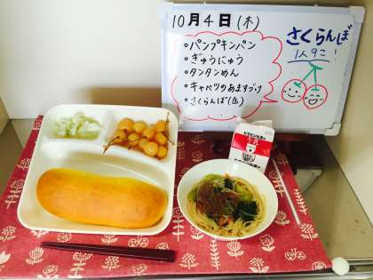 今日の給食は、タンタンめん、牛乳、キャベツの甘酢づけ、さくらんぼ(缶)、パンプキンパンです。