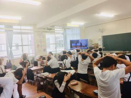 今日は、雨天のため、各教室で「姿勢体操」をしました。息をはきながら、大きく伸びる運動をしています。