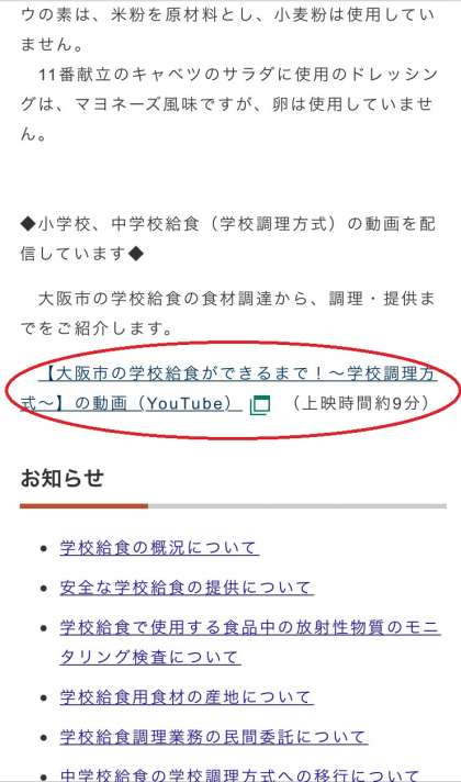 そちらからは、給食の詳しい献立表や給食の写真、そして大阪市の学校給食ができるまでの様子を映像にした動画が見れるyoutubeへ飛べるようになっております。