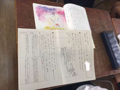 2年国語 学習の様子です。登場人物になりきって、音読しています。ワークシートに、登場人物の気持ちを書いています。