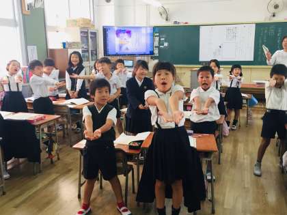 2年国語 学習の様子です。物語文「名前を見てちょうだい」を学習しています。登場人物「えっちゃん」になりきって、動作で気持ちを表現しています。