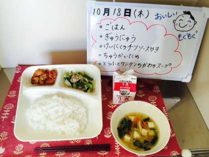 今日の給食は、ごはん、牛乳、鶏肉のチリソース焼き、中華いため、とうふとワンタンの皮のスープです。