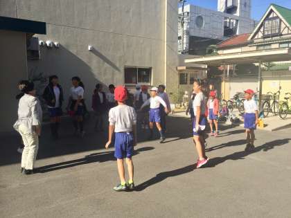 大正区 区民まつりで、子どもたちはリレーと大縄に参加します。準備運動をしています。