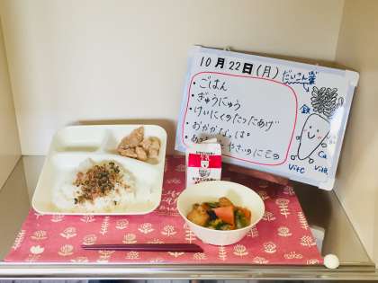 今日の給食は、けいにくのたつたあげ、おかかなっぱ、あつあげとやさいのにもの、ごはん、牛にゅうです。