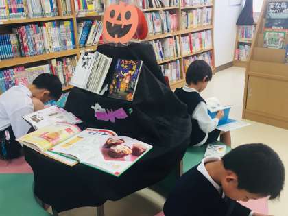 ハロウィンに関する本です。学校図書館補助員さんがレイアウトをしてくださっています。