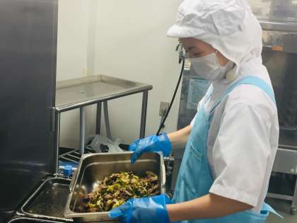 給食調理員(きゅうしょくちょうりいん)さんは、牛肉がダマ(かたまり)にならないように気をつけてつくってくださいました。