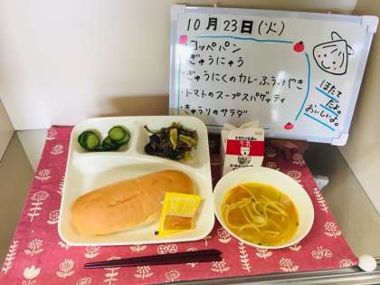 今日の給食は、牛肉(ぎゅうにく)のカレーふうみやき、トマトのスープスパゲッティ、きゅうりのサラダ、コッペパン、あんずジャム、牛にゅうです。