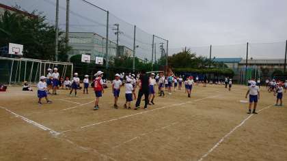 全校児童集会「ドッジボール大会」の様子です。たてわり班(異学年集団)で、元気いっぱいドッジボールで交流しています。