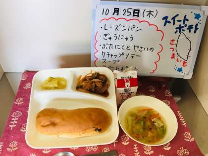 今日の給食は、レーズンパン、牛乳、豚肉と野菜のケチャップソテー、スープ、スイートポテトでした。