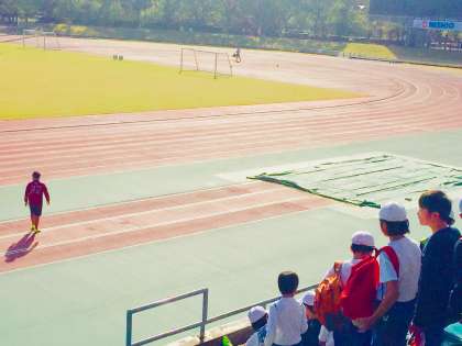 子どもたち、大きなグランドで驚いています。