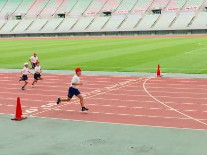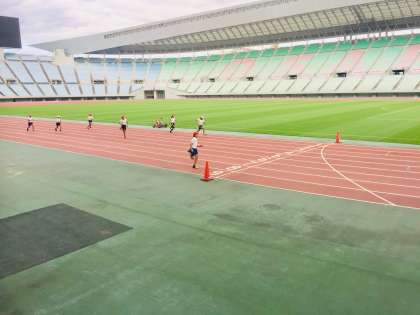 国際大会でも活用されているヤンマースタジアムで、100メートル走をしています。