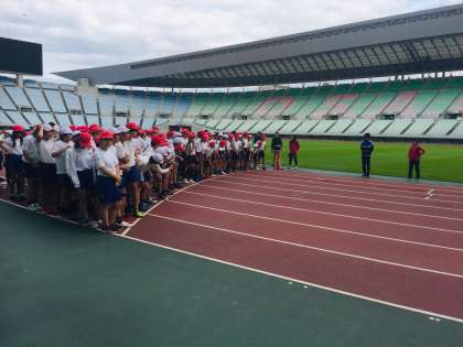 800メートル走の様子です。スポーツ交歓会に参加している児童全員が走りきりました。
