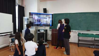 5年 BSスカイプ交流活動(Baika-Sangenyahigashi Skype Exchange Activity)の様子です。大阪市立梅香小学校とスカイプを使って交流しています。目的は「相手校の発表を聞くことで、実際に行っていない社会見学も疑似体験する」ことと、「自分たちの社会見学に生かす」ことです。今回は、初回で顔合わせ(スリーヒントクイズで自己紹介)をしています。