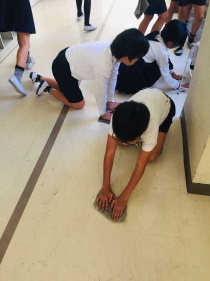 4年生が、ろうかの床拭きをしていました。