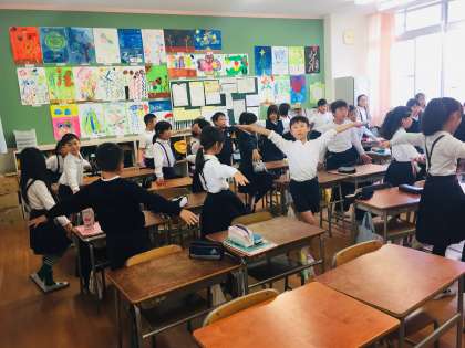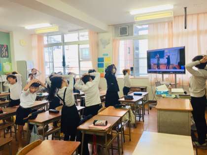 今日のP.E.タイムは、運動場が使えなかったため、各教室で姿勢体操をしました。