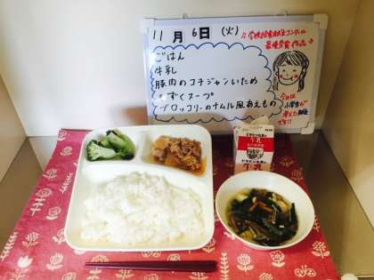 今日の給食は、平成29年度の学校給食献立コンクールで最優秀賞を受賞した献立です。福島区海老江西小学校5年い組の児童が考えました。献立は、ごはん、牛乳、豚肉のコチュジャンいため、もずくスープ、ブロッコリーのナムル風あえものです。