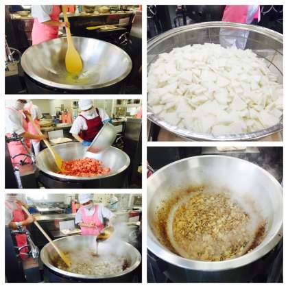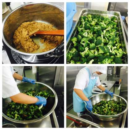 コチュジャンが豚肉によく合い、ごはんがすすむ味付けでした。写真は、今日の献立、豚肉のコチュジャンいためを作っている様子、ブロッコリーのナムル風あえものを作っている様子です。